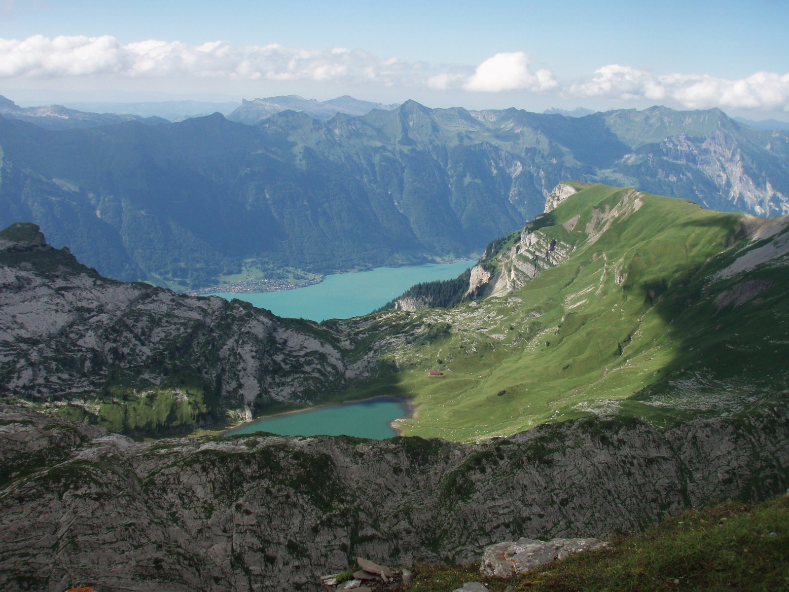 Sur la crête près de l’Oberberghorn, nous ne cessons d’admirer la vue plongeante sur le lac turquoise de Brienz. Puis notre regard se détourne vers la droite et les majestueux sommets de l’Eiger, du Mönsch et de la Jungfrau qui nous feront face pendant 2 jours.
