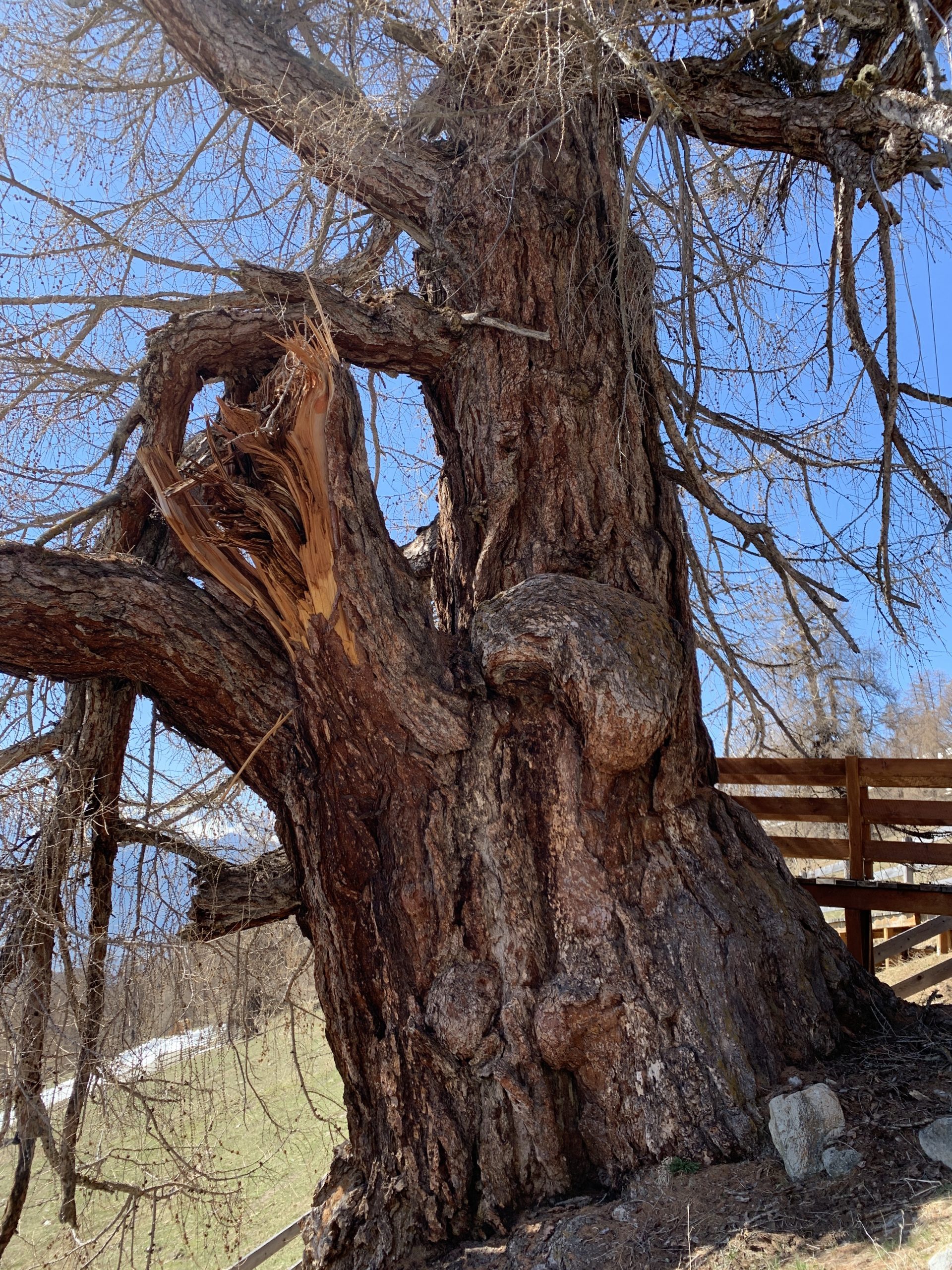 Plus de 250 mélèzes nous attendent sur leur pente bien exposée au soleil. Certains de ces géants solitaires, bientôt milénaires, nous impressionnent par leur gigantesque circonférence, leurs épaisses écorces et leurs branches bien trop lourdes et torturées.