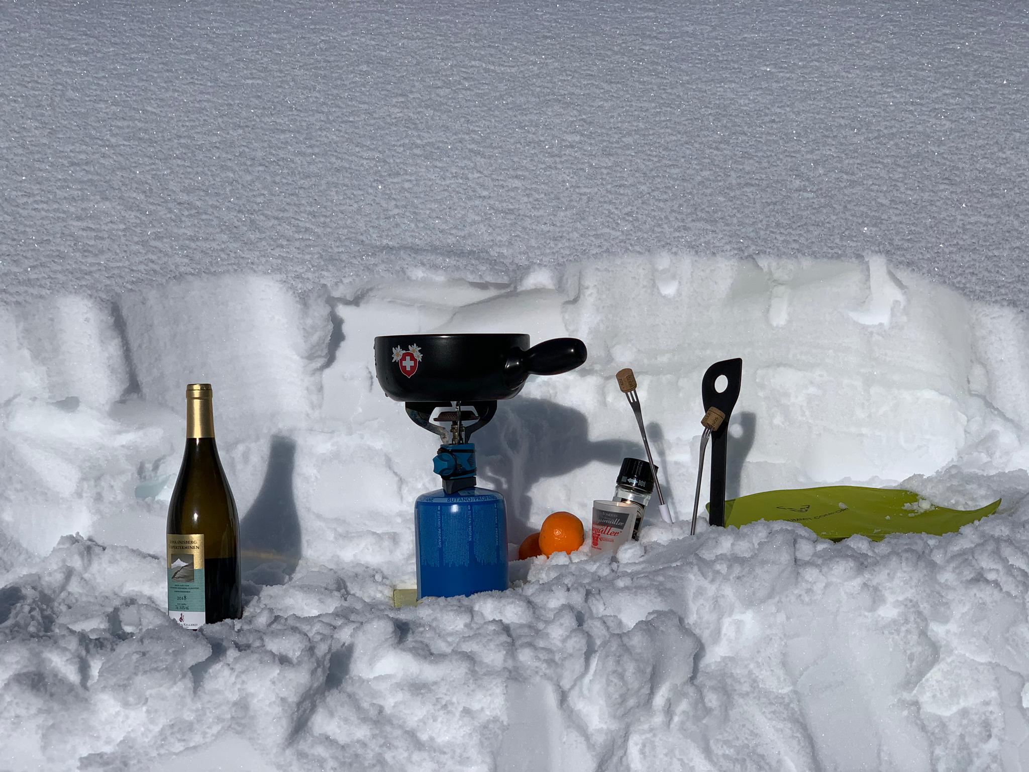 Itinéraire sauvage entre le col des Mosses et Pra Cornet avec une fondue dans la neige en admirant la vue sur la Tête du Lévanchy.